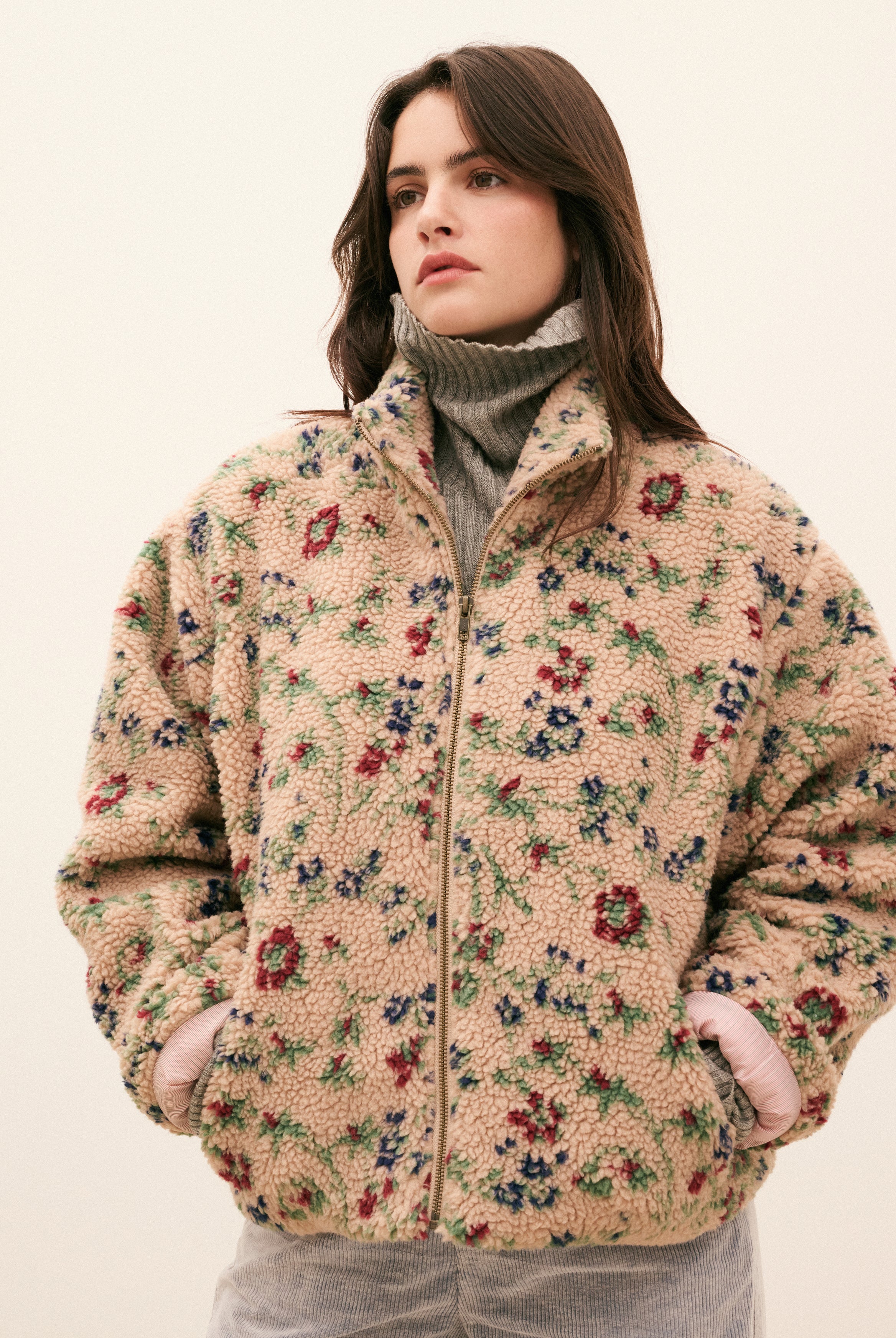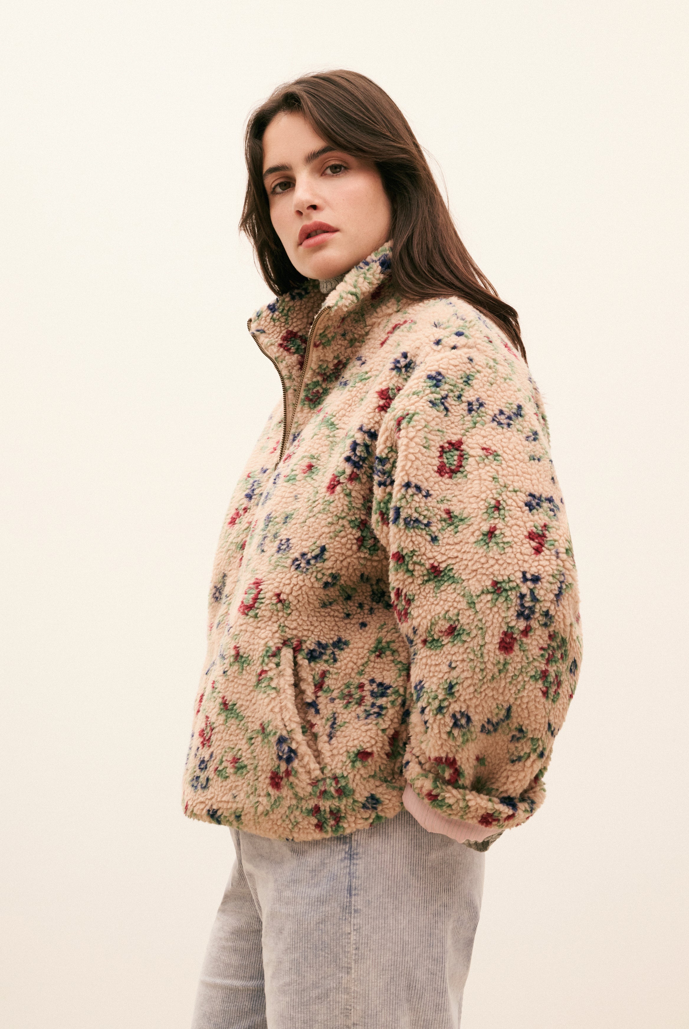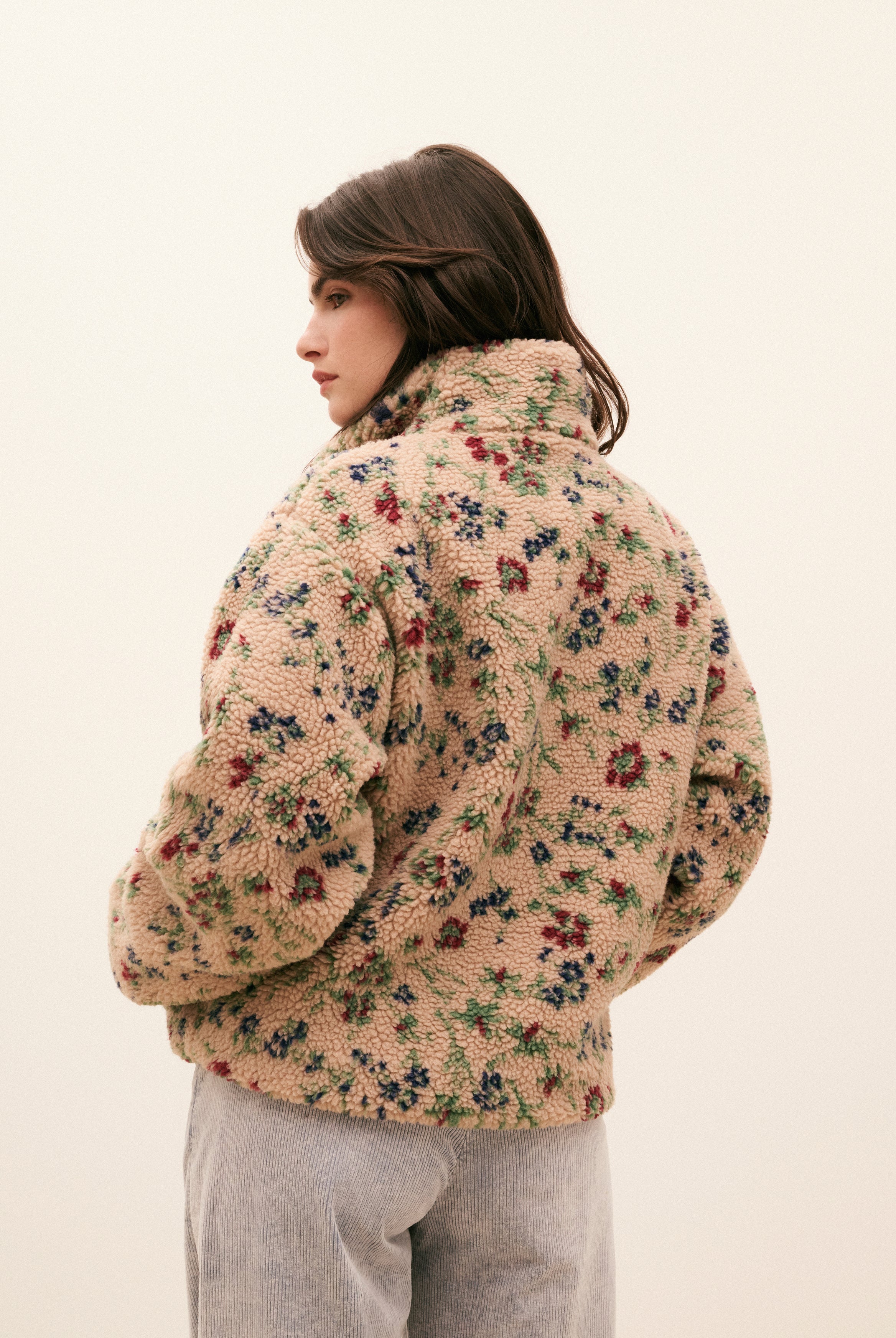 Une pièce inspirée des paysages balayés par le vent, qui capture l’esprit HOD et promet un confort absolu. Son effet lainé et ses fleurs colorées réchauffent les jours d’hiver, sans rien sacrifier à l’allure. Sherpa fleuri, volume généreux et chaleur enveloppante: le blouson Esther s’impose comme une évidence.